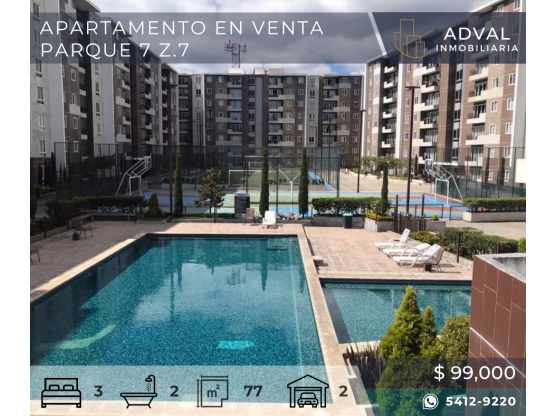 🏢 Apartamento en Venta Parque 7📍 Z.7 • 77mt2 • Sala • Comedor • Cocina • Habitación principal con walk in closet y baño completo • 2 Habitaciones secundarias con closet y baño compartido con visitas • 2 Parqueos ➡ Amenidades • Gimnasio • Canchas deportivas • Área social • Juegos infantiles • Piscinas Mini Market • Guardería • Construcción de Block, piso cerámico, puertas de MDF techo de terraza fundida y ventanas de PVC 💵 Precio de venta: $ 99,000 + impuestos • Tenemos alianza con todos los bancos del sistema te apoyamos con tu crédito. (G&T, BAC, BAM, BI, CHN, Arrend Leasing)📲 Para más información no dudes en comunicarte será un gusto poder apoyarte 5412-9220 WhatsApp.