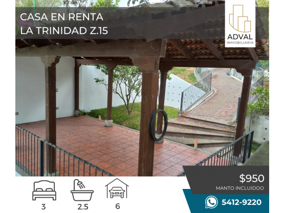 RENTA Casa La Trinidad Z.15 (sector del Hospital El Pilar) Casa para vivienda u oficinas. Sala Comedor Cocina con gabinetes y barra para desayunar Habitación principal con closet y baño 2 Habitaciones secundarias 1 Baño completo Lavandería Jardín mucha vegetación Pérgola 5 Parqueos Garita y casa con Golán Precio: $950 Manto Incluido. Para más información no dudes en comunicarte será un gusto poder apoyarte 5412-9220 WhatsApp.