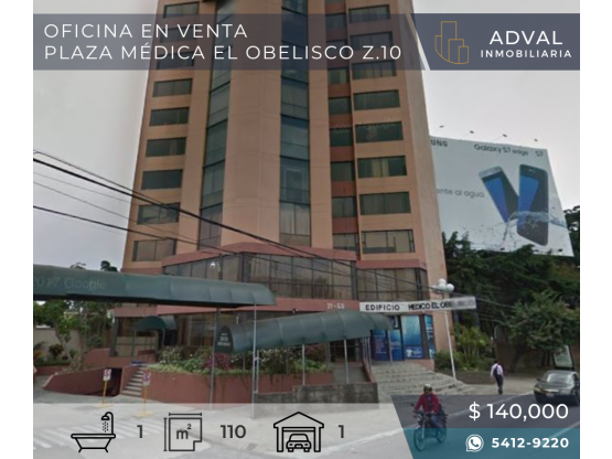 馃彚 VENTA Oficina Plaza Medica el Obelisco 馃搷 Z.10 • 110.46m² • Recepción • 3 Oficinas con closet • 2 Salas de reuniones • 1 Parqueos • 1 Baño 馃挼 Precio de venta $140,000 + impuestos • Tenemos alianza con todos los bancos del sistema te apoyamos con tu crédito. (G&T, BAC, BAM, BI, CHN, Arrend Leasing) 馃摬 Para más información no dudes en comunicarte será un gusto poder apoyarte 5412-9220 WhatsApp.